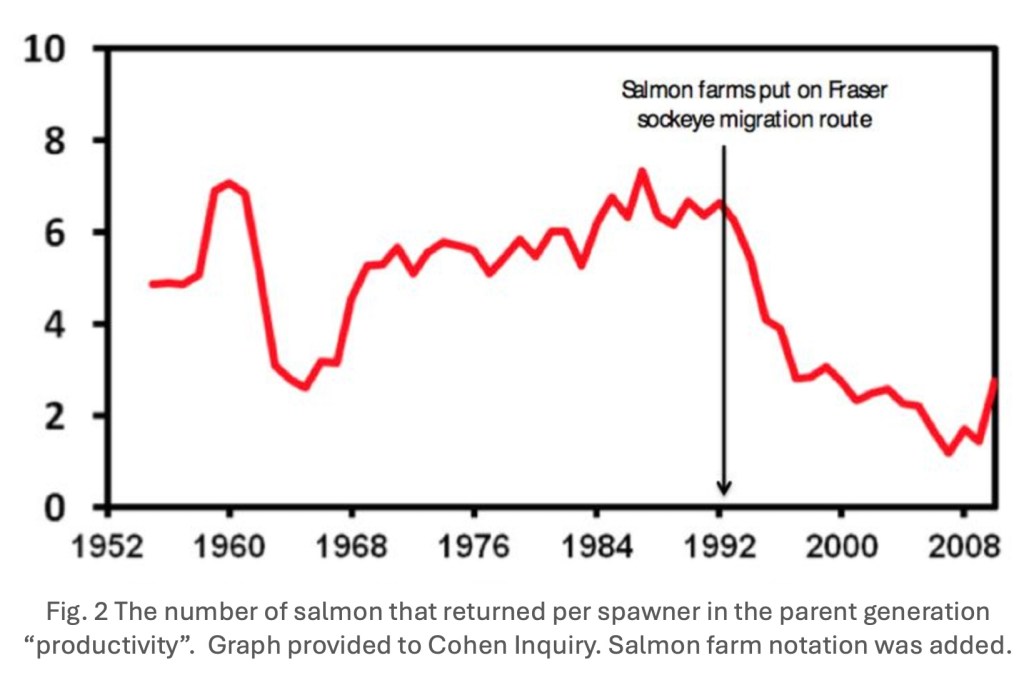 When salmon farms were placed on the Fraser River sockeye migration route in 1992, Fraser sockeye productivity went into decline. When the government of Canada removed those farms in 2021, every generation Fraser sockeye since then has significantly rebounded.